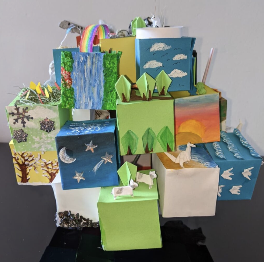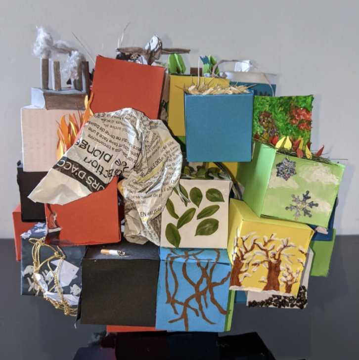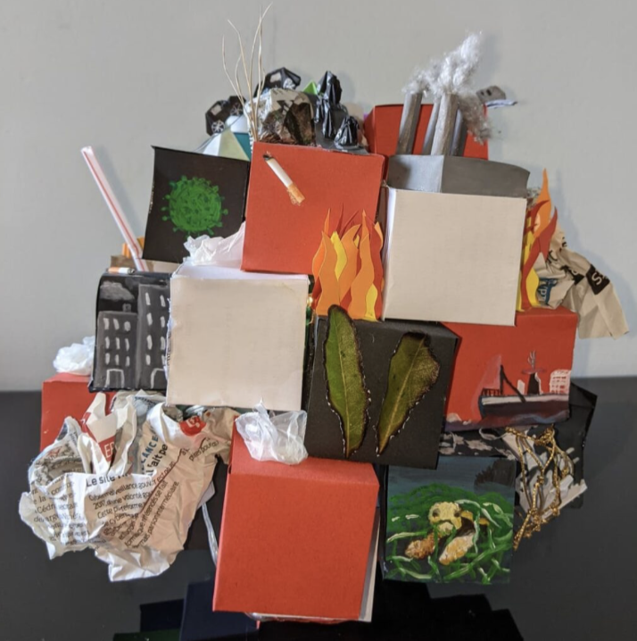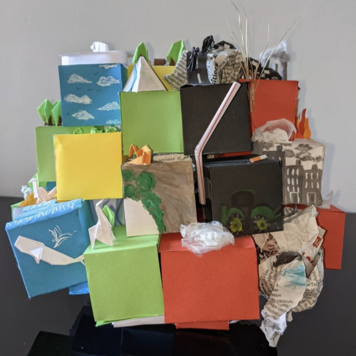 Ce projet « Pour un Monde Meilleur » reflète ma créativité. Très important pour moi, il représente mes valeurs environnementales et mes principes. Cette Terre contrastée avec deux parties très opposées montre la destruction actuelle et l’autre représente l’utopie d’un monde parfait. Ce message est une alerte aux changements pour que les activités humaines ne nuisent plus à l’environnement. Aujourd’hui, il faut arrêter d’être dans le déni et de procrastiner, il faut donc agir maintenant.